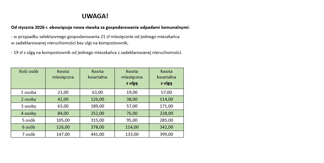 Od dnia 1 lipca 2016 roku obowiązują nowe terminy uiszczania opłat za gospodarowanie odpadami komunalnymi na terenie Gminy Tereszpol a mianowicie (§1 uchwały Rady Gminy Tereszpol Nr XIX/100/16):