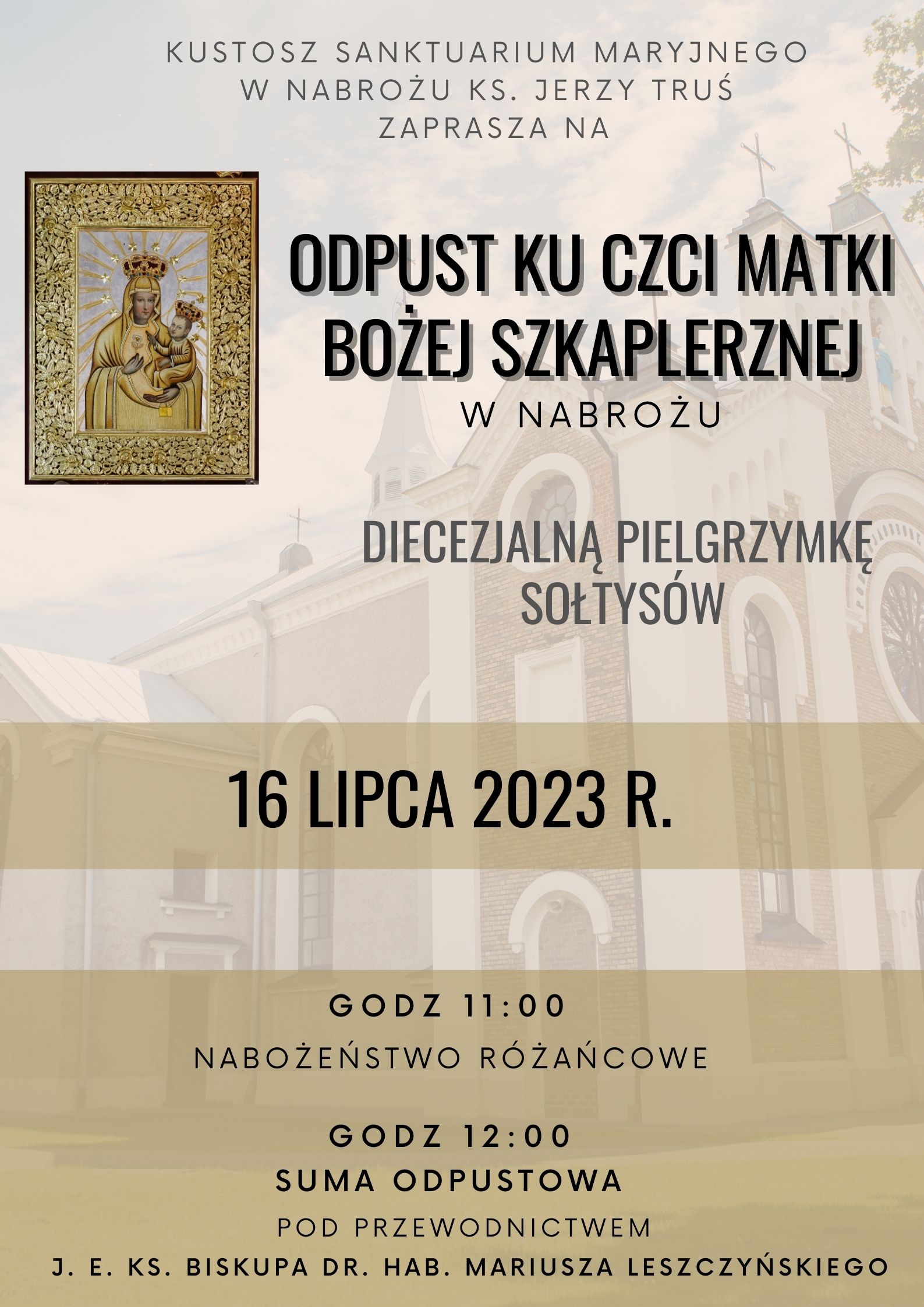 Proboszcz Parafii p.w. Wniebowzięcia NMP w Nabrożu, ks. Jerzy Truś zaprasza diecezjan, kapłanów, władze samorządowe, a szczególnie sołtysów oraz wszystkich czcicieli Matki Bożej na uroczystości odpustowe ku czci Matki Bożej Szkaplerznej i Diecezjalną Pielgrzymkę Sołtysów, w sobotę 16 lipca 2023 r. Sumie odpustowej o godz. 12.00, będzie przewodniczył Jego Ekscelencja Ks. Bp dr hab. Mariusz Leszczyński - Biskup Pomocniczy Diecezji Zamojsko-Lubaczowskiej.