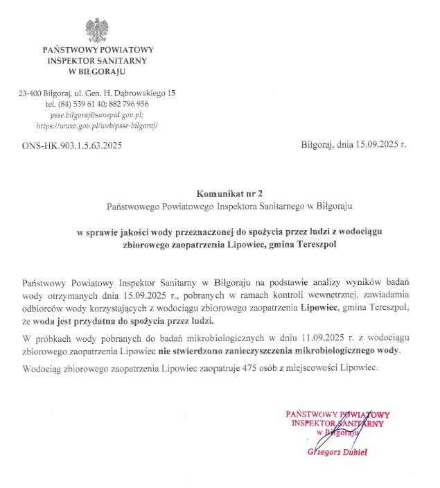 Woda zdatna do picia 2025.09.15 W sprawie jakości wody przeznaczonej do spożycia przez ludzi z wodociągu zbiorowego zaopatrzenia LIPOWIEC