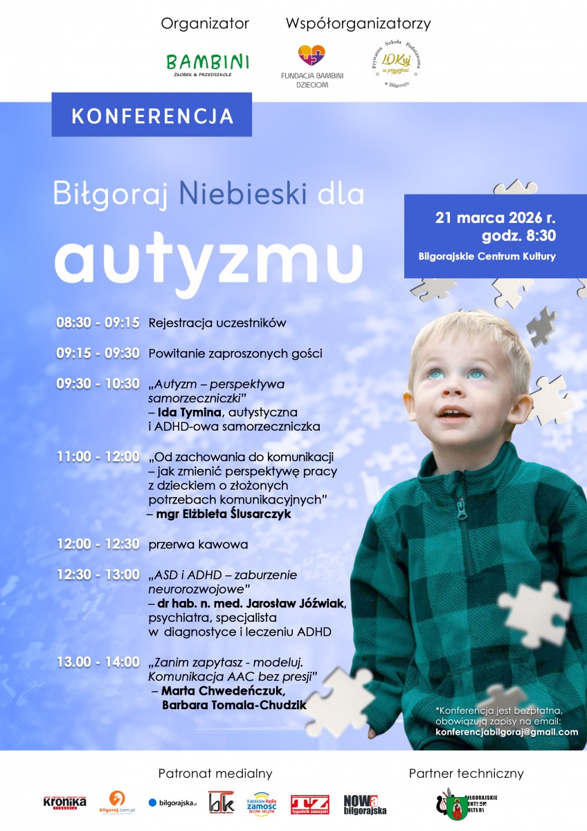 Wydarzenie odbędzie się 21 marca 2026 r. (w sobotę) o godz. 08:30 w Biłgorajskim Centrum Kultury. Prelegentem będzie m.in. dr hab. n. med. Jarosław Jóźwiak — psychiatra, specjalista w diagnostyce i leczeniu ADHD oraz specjaliści od komunikacji alternatywnej i wspomagającej.