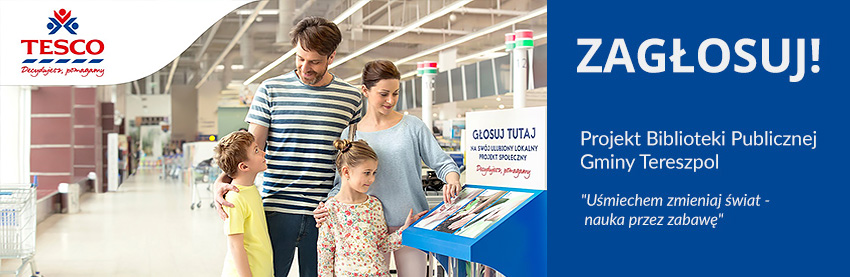 Projekt Biblioteki Publicznej Gminy Tereszpol "Uśmiechem zmieniaj świat - nauka przez zabawę" został zakwalifikowany do II etapu programu grantowego „Decydujesz, pomagamy”. Wysokość dofinansowania zależy od ilości oddanych przez Państwa głosów. Głosować można od 21 stycznia do 17 lutego w sklepie Tesco w Biłgoraju.