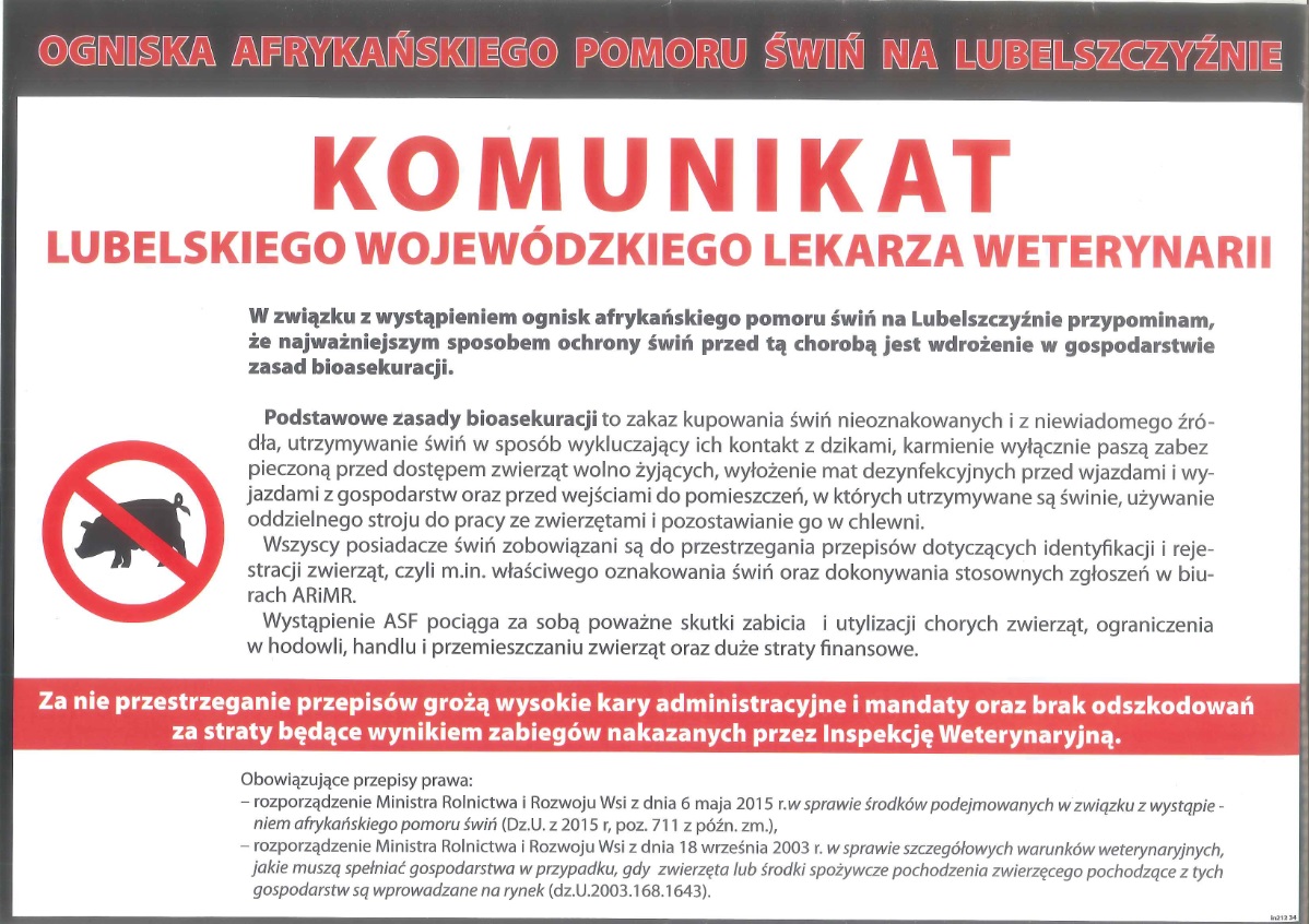 W związku z wystąpieniem ognisk afrykańskiego pomoru świń na Lubelszczyźnie Wojewódzki lekarz weterynarii przypomina, że najważniejszym sposobem ochrony świń przed tą chorobą jest wdrożenie w gospodarstwie zasad bioasekuracji.