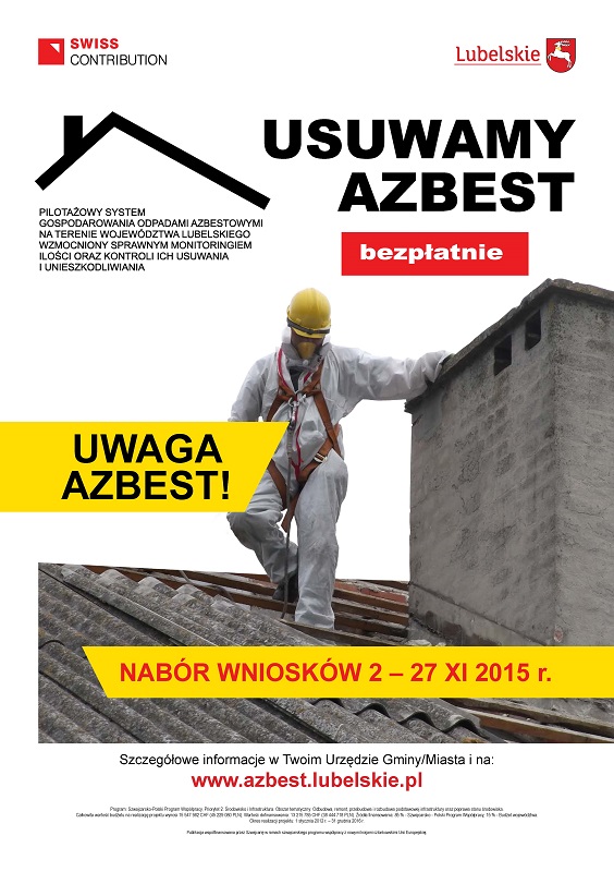 W Gminie Tereszpol w dniach od 2 do 27 listopada 2015 roku zostanie przeprowadzony nabór wniosków na bezpłatne usuwanie odpadów i wyrobów zawierających azbest. (dotyczy wyrobów znajdujących się na dachu budynku jak i również zdeponowanych na posesji przed 06.05.2004 r.). Wszystkie informacje dotyczące projektu udziela Andrzej Mazurek, tel. (84) 687 66 47, e-mail: amazurek@tereszpol.pl w Urzędzie Gminy Tereszpol w pok. Nr 16 oraz na stronie internetowej: www.azbest.lubelskie.pl