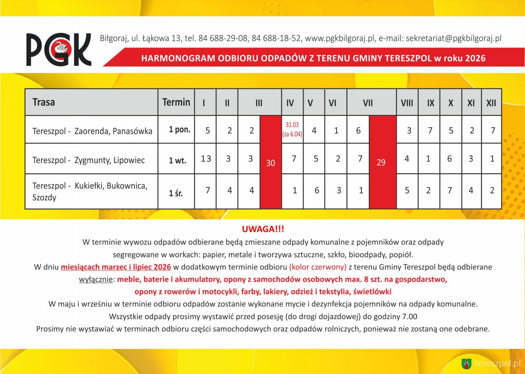 Od dnia 1 lipca 2016 roku obowiązują nowe terminy uiszczania opłat za gospodarowanie odpadami komunalnymi na terenie Gminy Tereszpol a mianowicie (§1 uchwały Rady Gminy Tereszpol Nr XIX/100/16):