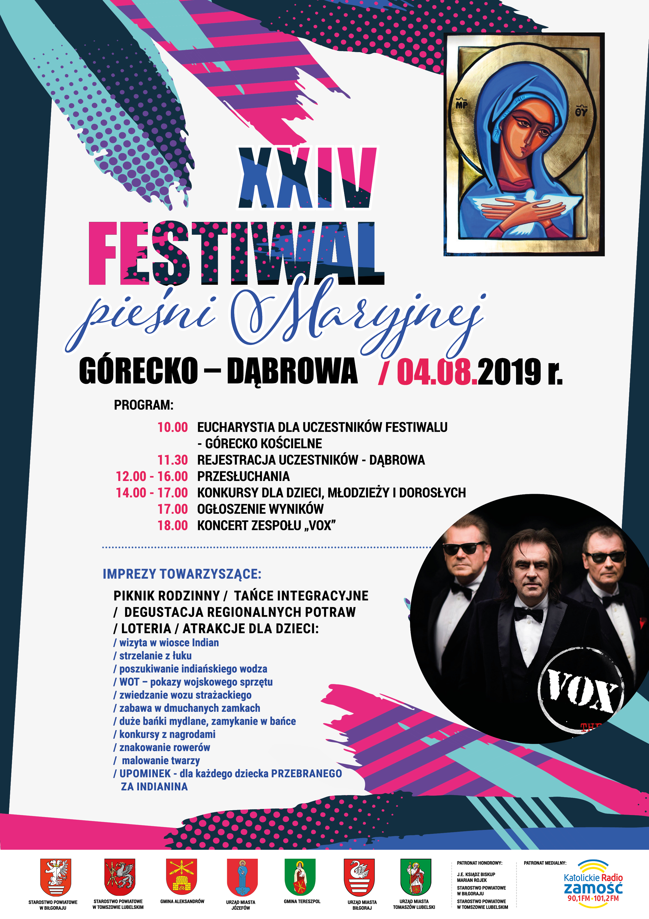4 sierpnia 2019 r. odbędzie się XXIV Festiwal Pieśni Maryjnej w Górecku Kościelnym – Dąbrowa. Będzie wiele atrakcji dla dzieci, młodzieży i dorosłych. Gwiazdą wieczoru ma być zespół VOX. Serdecznie zapraszamy.