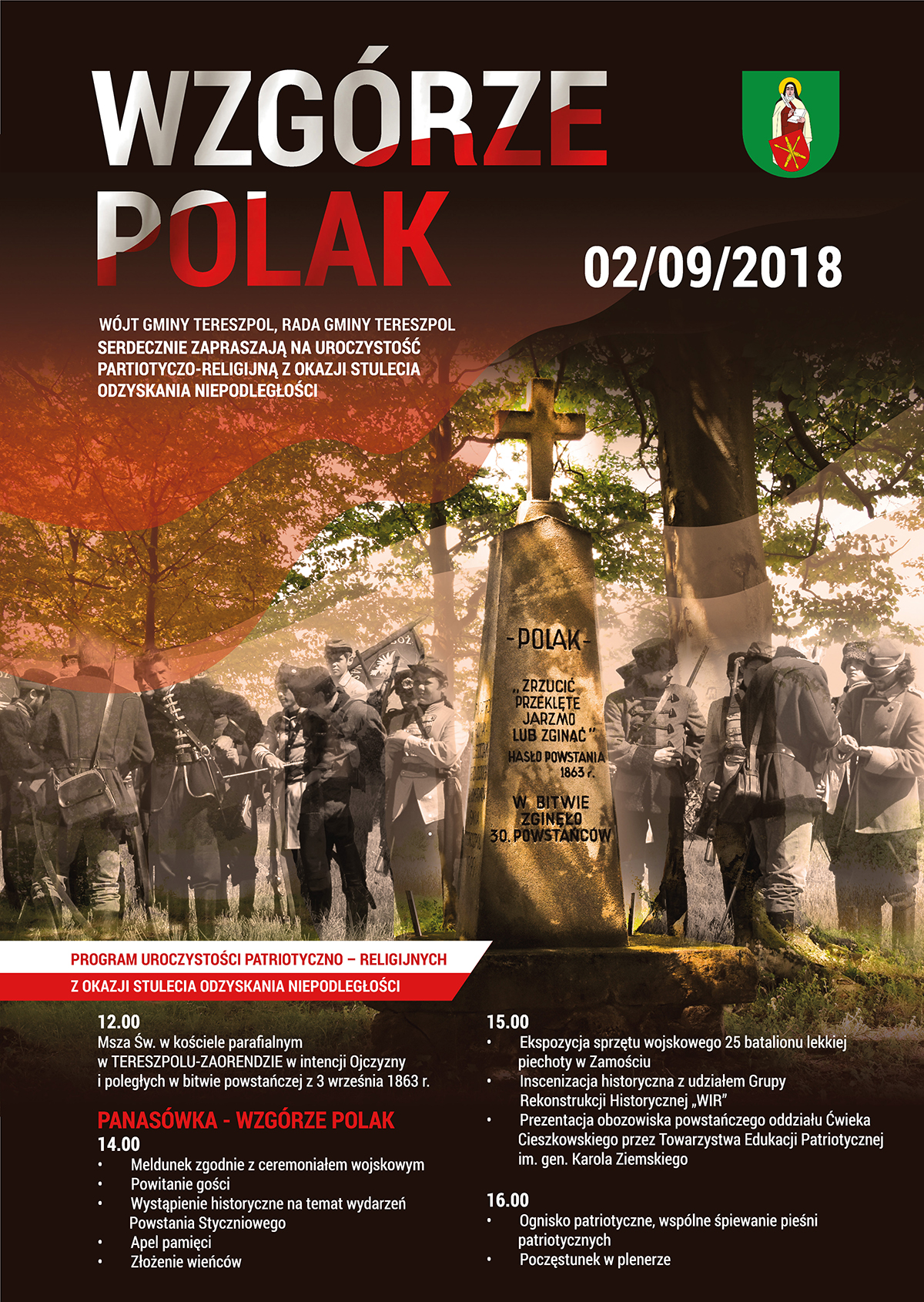 Wójt gminy Tereszpol oraz Rada Gminy Tereszpol serdecznie zapraszają 2 września 2018 r. na uroczystość partiotyczno-religijną z okazji stulecia odzyskania niepodległości.
