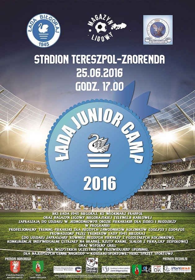 BKS Łada 1945 Biłgoraj, KS Orzeł Tereszpol oraz Magazyn Ligowy Biłgorajskiej Telewizji Kablowej zapraszają do udziału w jednodniowym obozie piłkarskim dla dzieci i młodzieży na stadion w Tereszpolu-Zaorendzie w dniu 25.06.2016 (sobota) na godzinę 15:00. W programie zostanie przeprowadzony profesjonalny trening piłkarski dla młodych zawodników prowadzony przez trenerów Łady 1945 Biłgoraj.