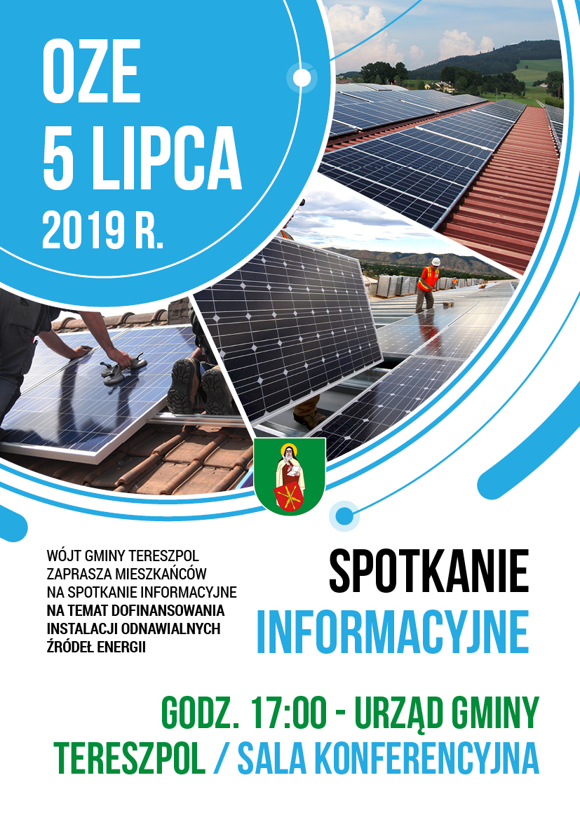 Wójt Gminy Tereszpol zaprasza mieszkańców Gminy na spotkanie informacyjne na temat dofinansowania instalacji odnawialnych źródeł energii dnia 5 lipca 2019 r. o godz. 17:00 w Urzędzie Gminy Tereszpol (sala konferencyjna). Realizacja projektu jest uzależniona od uzyskania dofinansowania udzielanego w ramach konkursu przez Urząd Marszałkowski Województwa Lubelskiego w Lublinie z RPO Województwa Lubelskiego, działania 4.1. Wsparcie wykorzystania OZE.