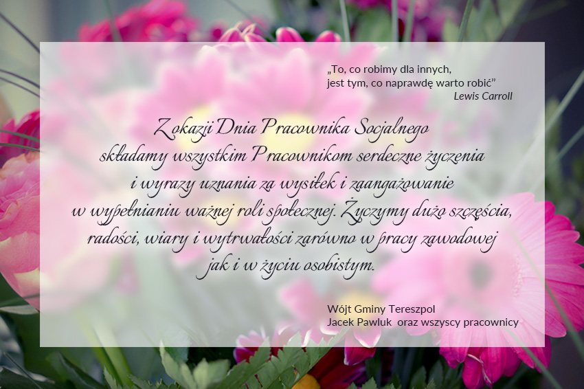 Z okazji Dnia Pracownika Socjalnego składamy wszystkim Pracownikom serdeczne życzenia i wyrazy uznania za wysiłek i zaangażowanie w wypełnianiu ważnej roli społecznej. Życzymy dużo szczęścia, radości, wiary i wytrwałości zarówno w pracy zawodowej jak i w życiu osobistym.