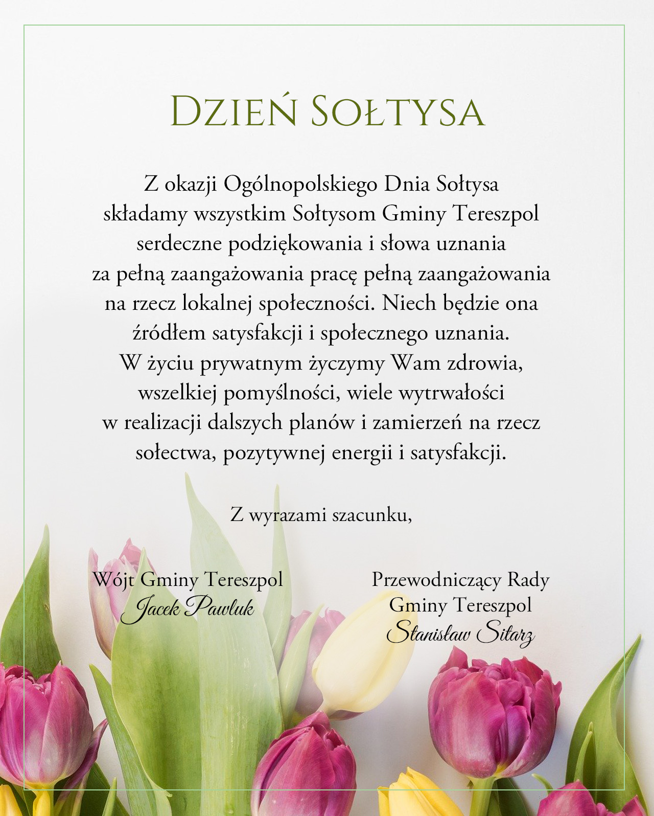 Z okazji Ogólnopolskiego Dnia Sołtysa składamy wszystkim Sołtysom Gminy Tereszpol serdeczne podziękowania i słowa uznania za pełną zaangażowania pracę na rzecz lokalnej społeczności. Niech będzie ona źródłem satysfakcji i społecznego uznania.