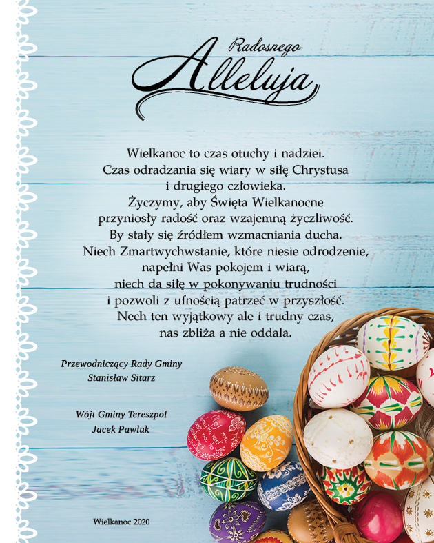 Wielkanoc to czas otuchy i nadziei. Czas odradzania się wiary w siłę Chrystusa i drugiego człowieka. Życzymy, aby Święta Wielkanocne przyniosły radość oraz wzajemną życzliwość. By stały się źródłem wzmacniania ducha. Niech Zmartwychwstanie, które niesie odrodzenie, napełni Was pokojem i wiarą, niech da siłę w pokonywaniu trudności i pozwoli z ufnością patrzeć w przyszłość. Niech ten wyjątkowy ale i trudny czas, nas zbliża a nie oddala.