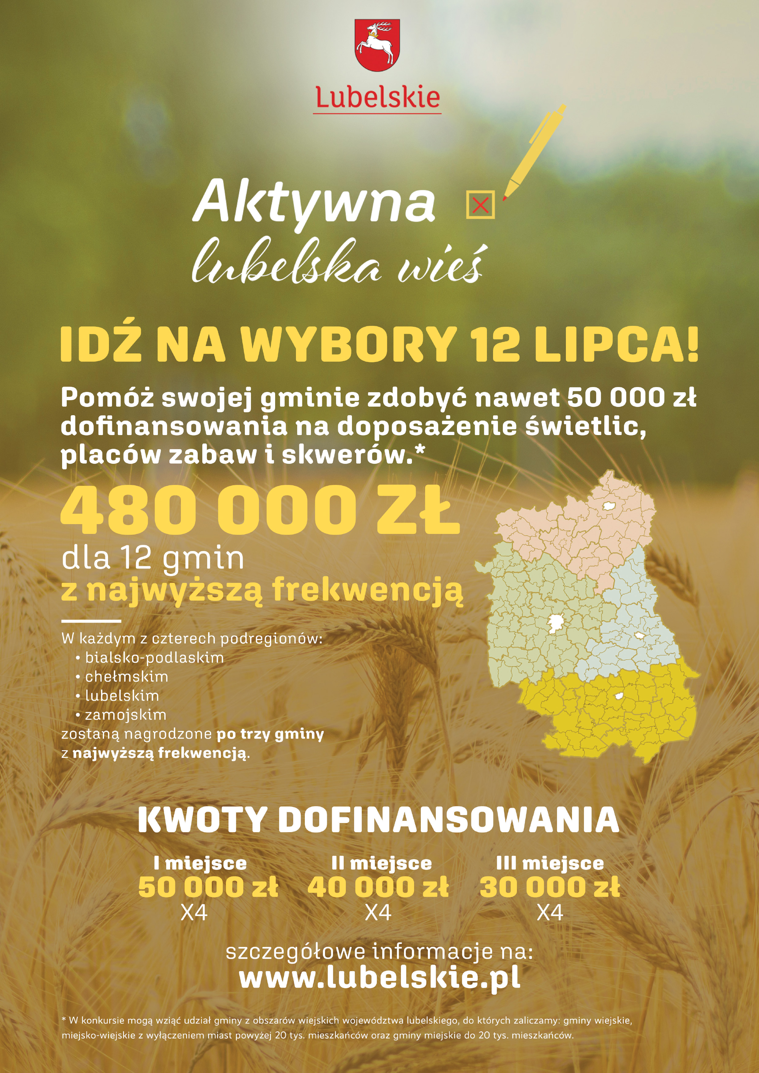 Samorząd Województwa Lubelskiego przekaże na ten cel nagrody finansowe w wysokości 50 000 zł, 40 000 zł oraz 30 000 zł, gminom z najwyższą procentową frekwencją wyborczą. Gminy zostaną sklasyfikowane w czterech regionach naszego województwa, podzielonych według starego podziału administracyjnego. Łączna kwota dofinansowania ze środków budżetu województwa lubelskiego wynosi 480 000 złotych.