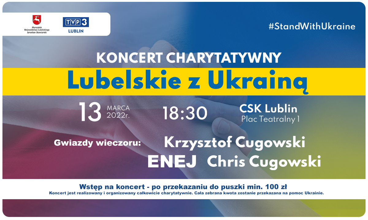 Koncert jest realizowany całkowicie charytatywnie. Do udziału w wydarzeniu uprawnia przekazanie cegiełki na rzecz pomocy uchodźców z ogarniętej wojną Ukrainy. Wartość cegiełki to min. 100 zł. Datek można przekazać w dniu koncertu wolontariuszom z CSK lub wcześniej w Księgowości TVP Lublin, a w zamian otrzyma się kartę wstępu. Informacje i rezerwacje pod nr. tel. 601 600 622