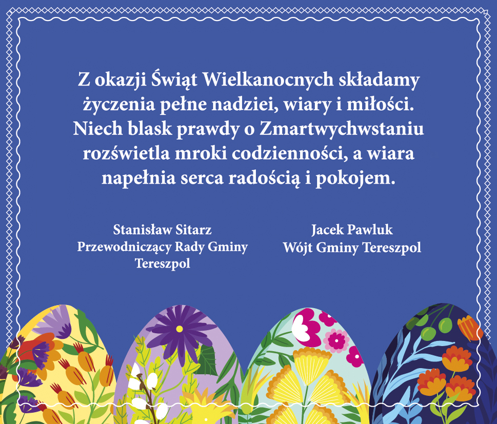 Z okazji Świąt Wielkanocnych składamy życzenia pełne nadziei, wiary i miłości. Niech blask prawdy o Zmartwychwstaniu rozświetla mroki codzienności, a wiara w nowe życie napełnia serca radością i pokojem. Życzymy, aby Święta przyniosły spokój, radość oraz wzajemną życzliwość. Niech w sercach zagości nadzieja odradzającego się życia.