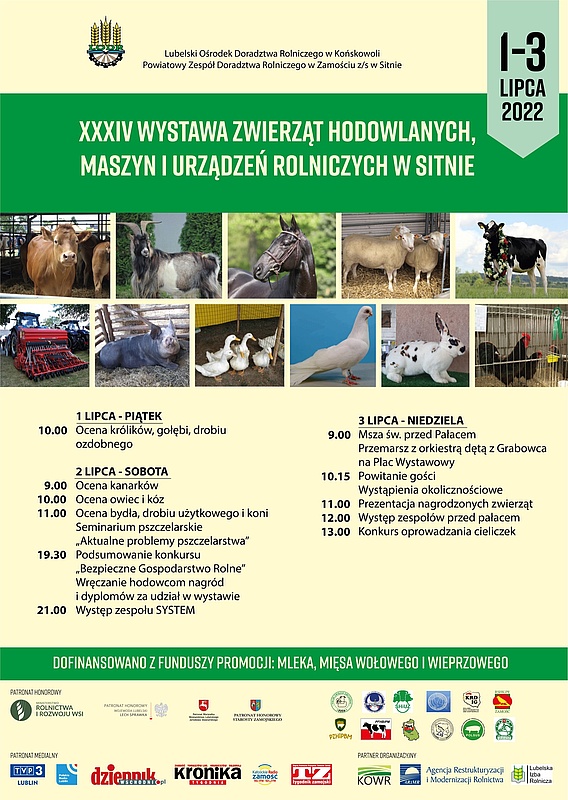 Zapraszamy na XXXIV Wystawę Zwierząt Hodowlanych, Maszyn i Urządzeń Rolniczych w Sitnie 3 lipca 2022 r. (niedziela). Zapisów można dokonywać u sołtysów lub w Urzędzie Gminy Tereszpol (sekretariat) pod nr tel. 84 687 66 31.