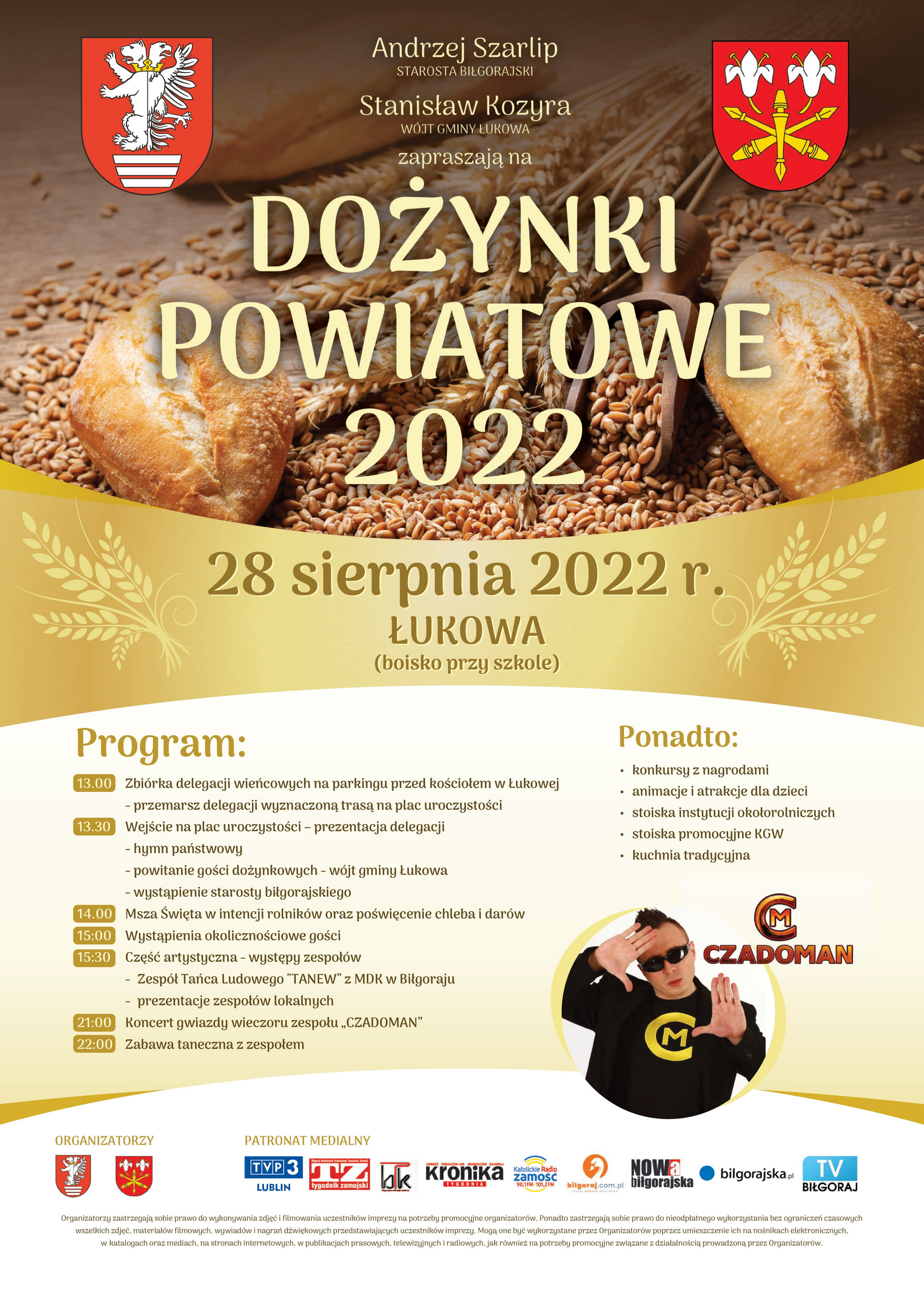 Uroczystość rozpocznie się przemarszem delegacji wieńcowych sprzed kościoła na plac uroczystości przy Szkole Podstawowej w Łukowej. Tam nastąpi prezentacja delegacji. Następnie odegrany zostanie hymn państwowy. Po wystąpieniu gospodarzy uroczystości oprawiona zostanie Msza Święta w intencji rolników oraz nastąpi poświęcenie chleba i darów. W części artystycznej wystąpi Zespół Tańca Ludowego "TANEW" z Młodzieżowego Domu Kultury w Biłgoraju oraz lokalne zespoły. Gwiazdą wieczoru będzie koncert zespołu „CZADOMAN”. Zaplanowano go na godz. 21:00. Wydarzenie zakończy zabawa taneczna pod gwiazdami.