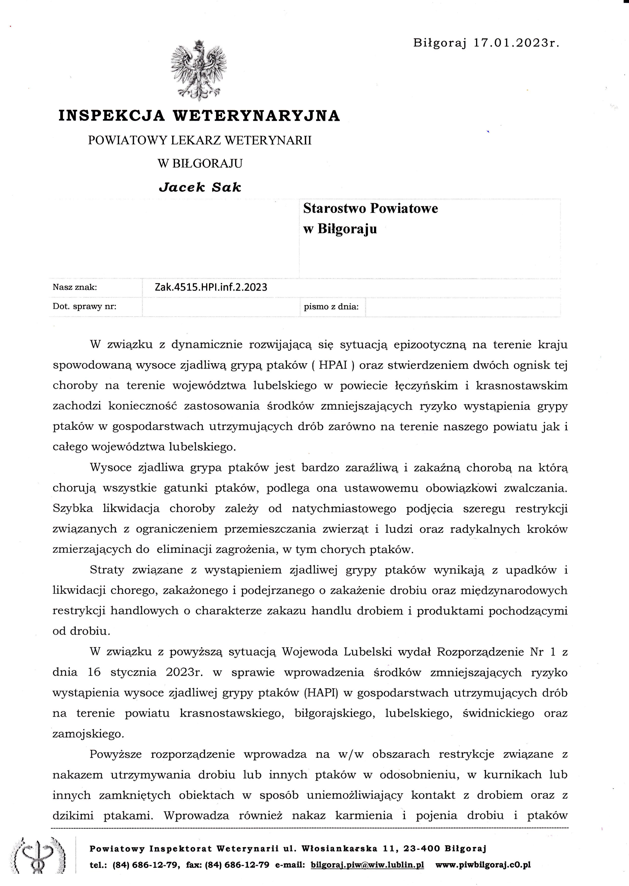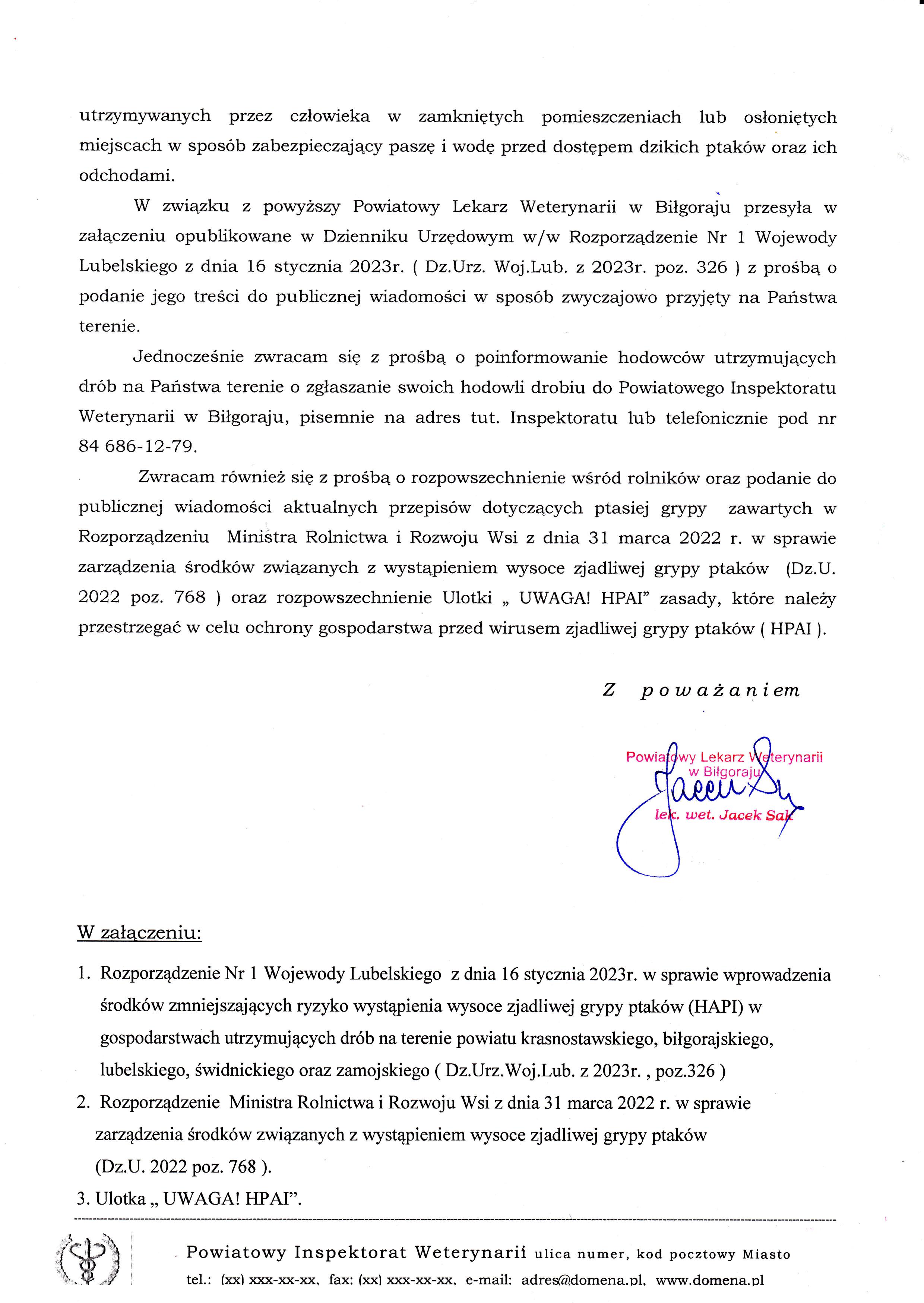 Ptasia grypa 2023.01.23 Pismo Powiatowego Lekarza Weterynarii w Biłgoraju w sprawie ptasiej grypy. Rozporzadzenie Ministra Rolnictwa.pdf Rozporządzenie Wojewody Lubelskiego.pdf