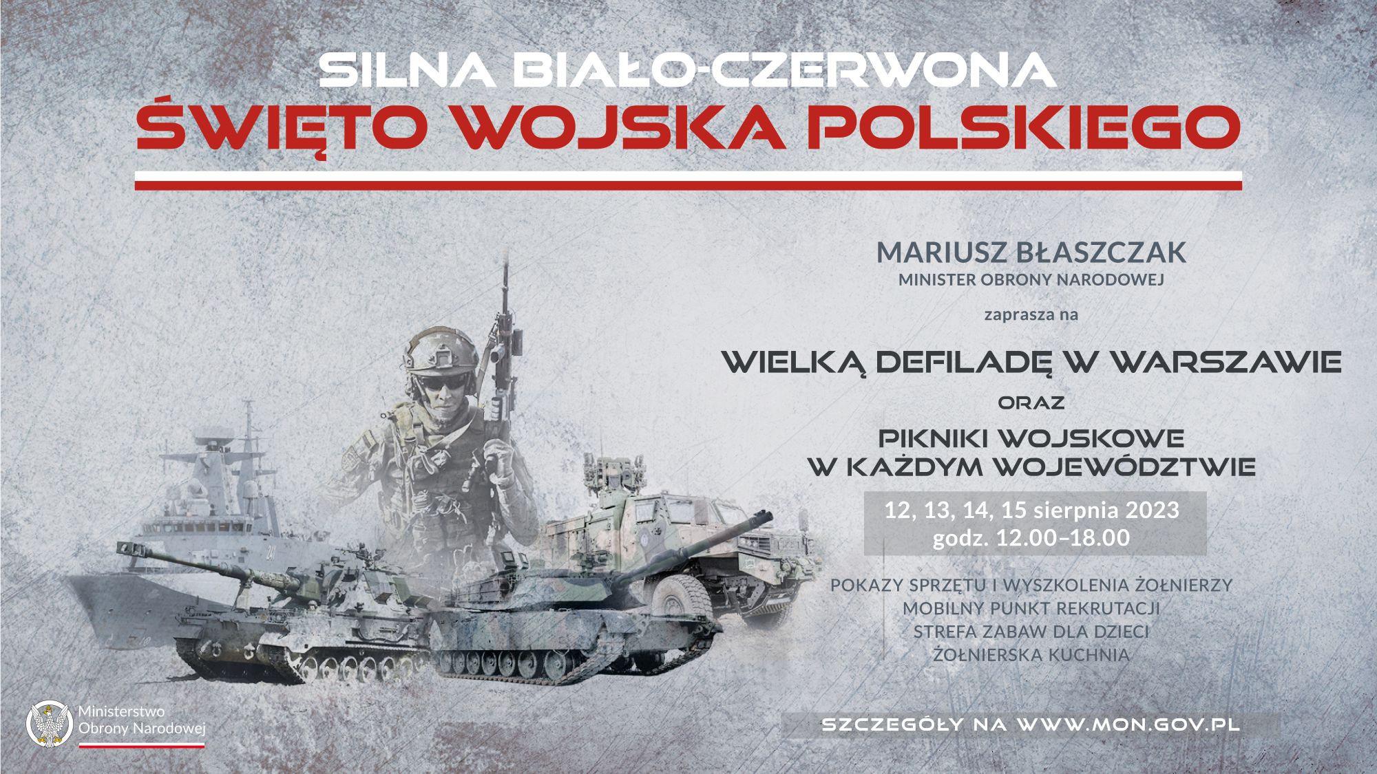 Takim punktem kulminacyjnym oczywiście będzie 15 sierpnia, Warszawa i defilada. O 14:00 rozpocznie się defilada. W defiladzie uczestniczyć będą żołnierze wszystkich rodzajów polskich sił zbrojnych. Będzie także pokaz nowoczesnego sprzętu, więc będą czołgi Abrams, będą czołgi K2, będą bojowe wozy piechoty Borsuk – mówił Mariusz Błaszczak, minister obrony narodowej.