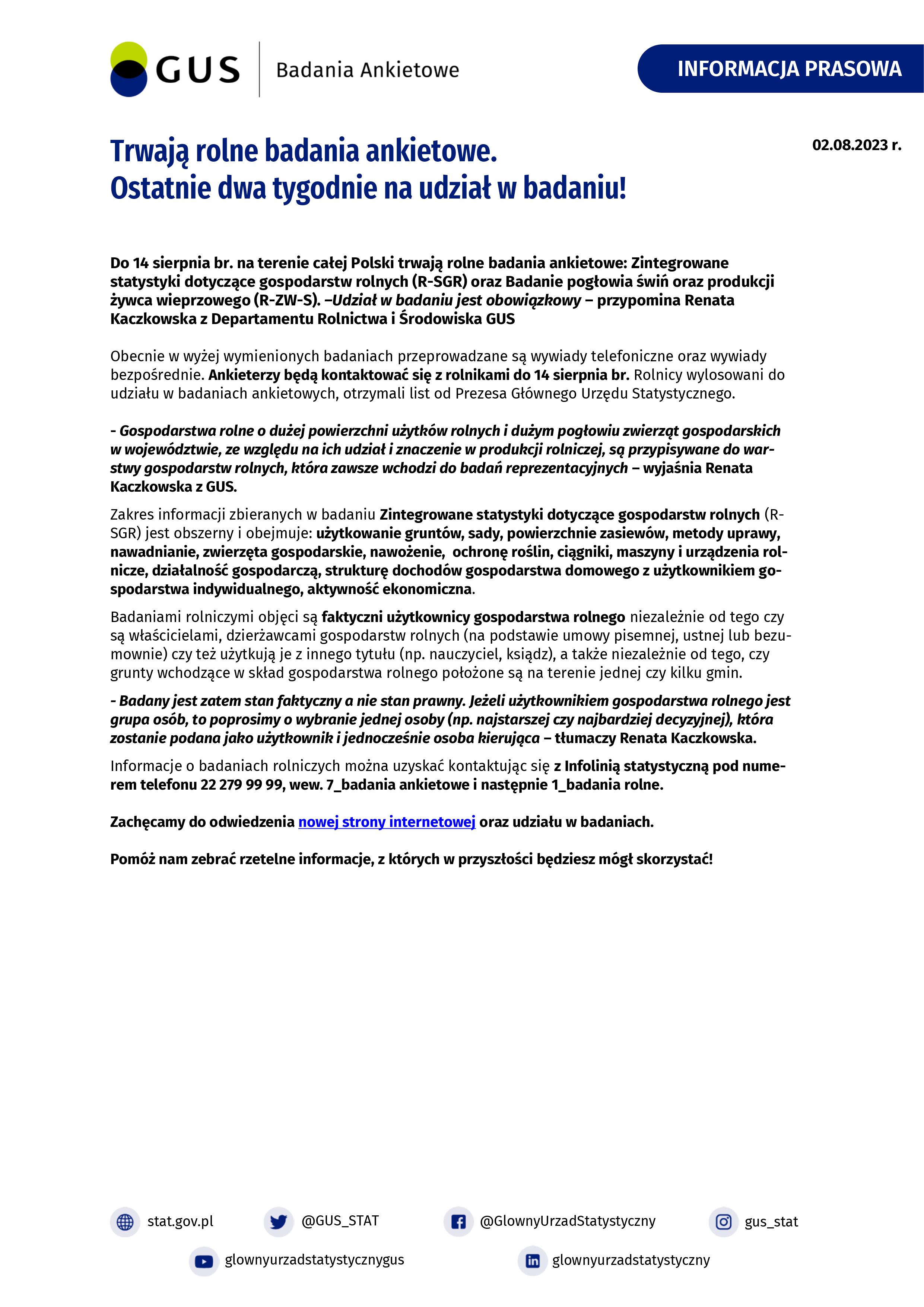 Obecnie w wyżej wymienionych badaniach przeprowadzane są wywiady telefoniczne oraz wywiady bezpośrednie. Ankieterzy będą kontaktować się z rolnikami do 14 sierpnia br. Przypomnijmy, że udział w badaniu jest obowiązkowy, a rolnicy wylosowani do udziału w badaniach ankietowych, otrzymali list od Prezesa Głównego Urzędu Statystycznego.