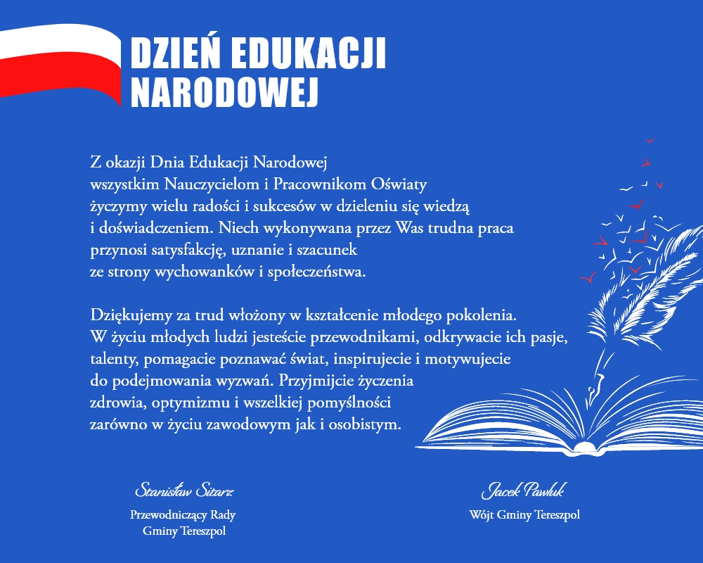 Z okazji Dnia Edukacji Narodowej wszystkim Nauczycielom i Pracownikom Oświaty życzymy wielu radości i sukcesów w dzieleniu się wiedzą i doświadczeniem. Niech wykonywana przez Was trudna praca przynosi satysfakcję, uznanie i szacunek ze strony wychowanków i społeczeństwa. Dziękujemy za trud włożony w kształcenie młodego pokolenia. W życiu młodych ludzi jesteście przewodnikami, odkrywacie ich pasje, talenty, pomagacie poznawać świat, inspirujecie i motywujecie do podejmowania wyzwań. Przyjmijcie życzenia zdrowia, optymizmu i wszelkiej pomyślności zarówno w życiu zawodowym jak i osobistym.