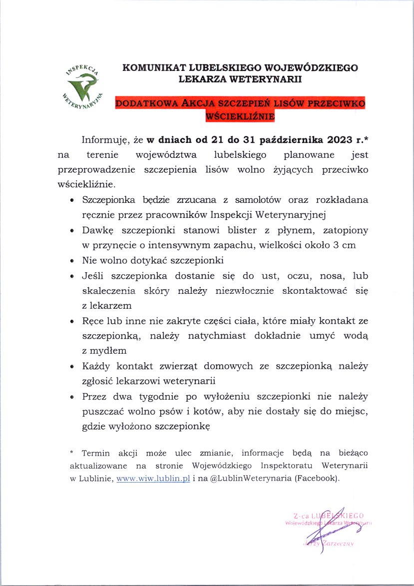 W załączeniu komunikat Lubelskiego Wojewódzkiego Lekarza Weterynarii dotyczący szczegółów akcji szczepienia lisów przeciwko wściekliźnie na terenie województwa lubelskiego