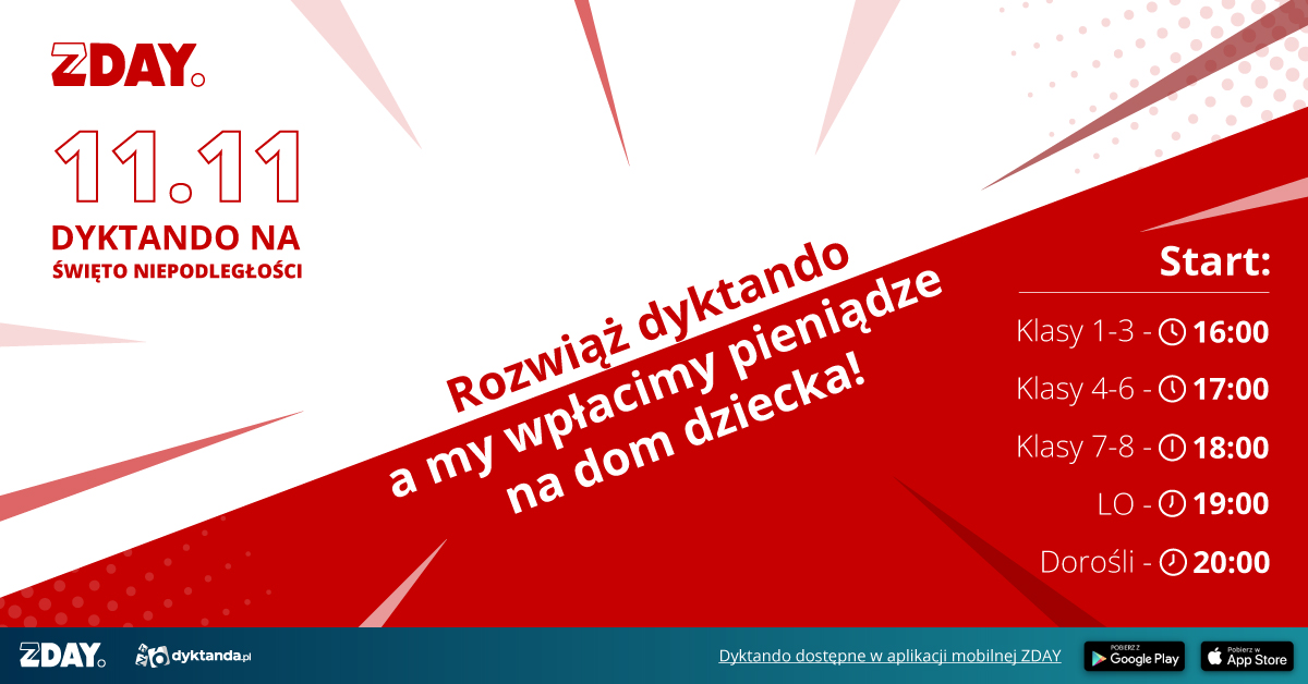 Dyktando będzie przygotowane specjalnie na tę okazję. Będzie poruszało wątki patriotyczne, {wspominało znane postacie i wydarzenia. Dyktando będzie można rozwiązać w aplikacji ZDAY.