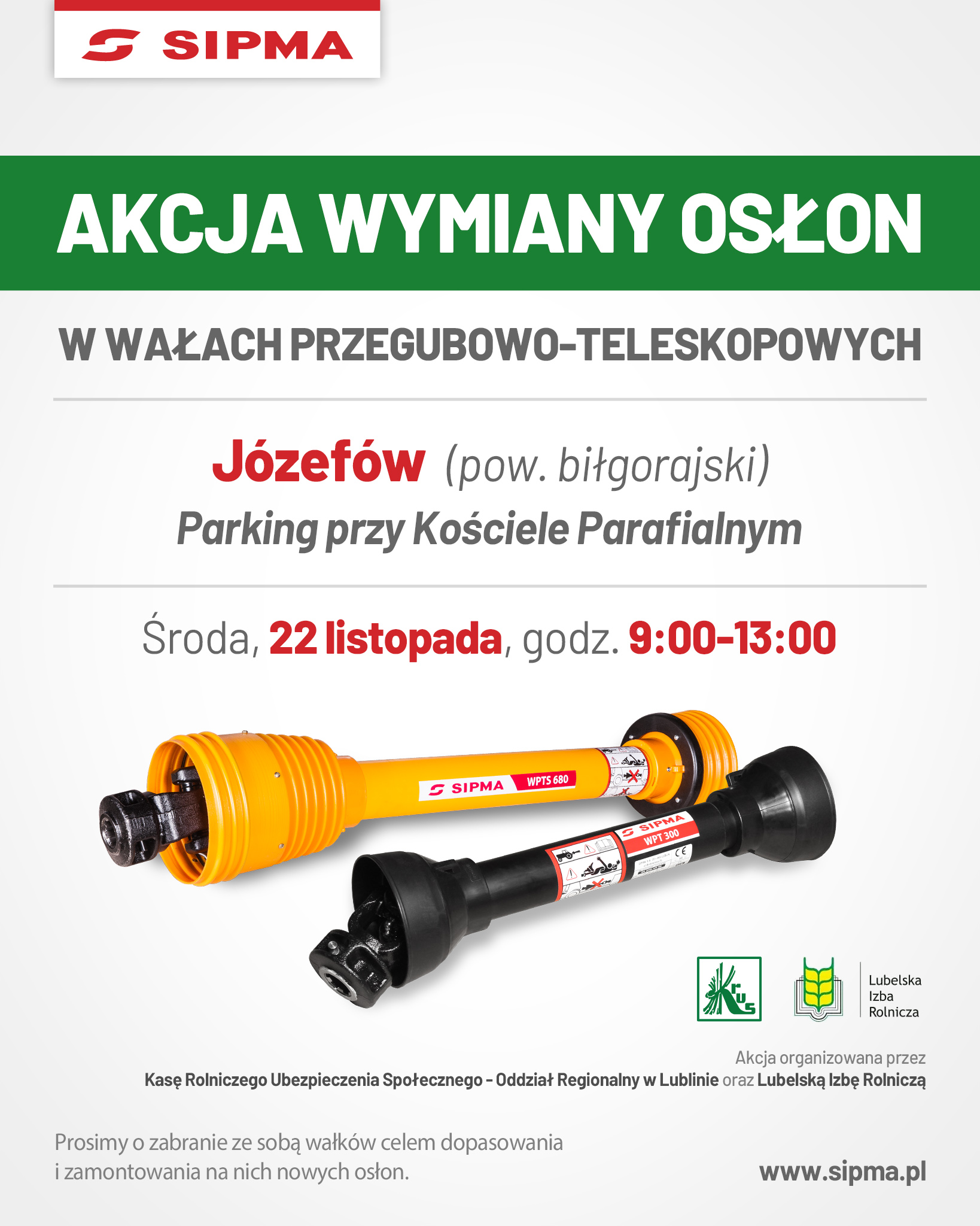 Kasa Rolniczego Ubezpieczenia Społecznego i Lubelska Izba Rolnicza w porozumieniu z firmą SIPMA SA organizuje akcję wymiany osłon wałków przekaźnika mocy w dniu 22 listopada w godz. 9.00 – 13.00 na parkingu przy Kościele Parafialnym w Józefowie. Koszt dla rolnika to tylko 20 zł za osłonę. Inicjatywa ta wpisuje się w działalność Kasy na rzecz zapobiegania wypadkom w rolnictwie.