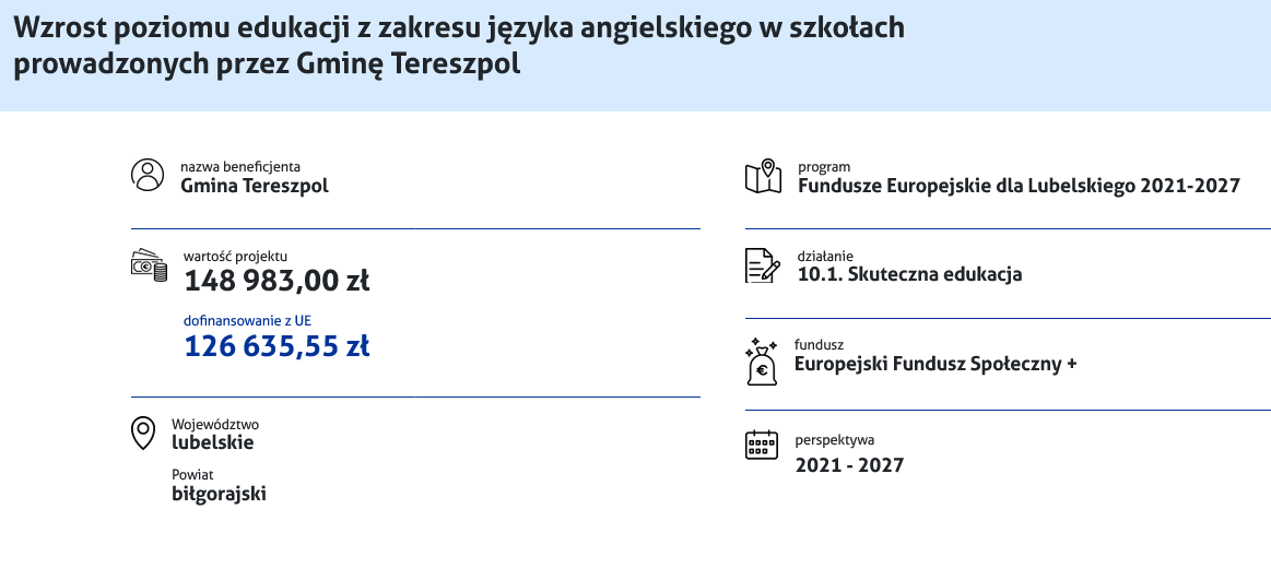 Wójt Gminy Tereszpol zaprasza do udziału w rekrutacji do projektu pt. „Wzrost poziomu edukacji z zakresu języka angielskiego w szkołach prowadzonych przez Gminę Tereszpol” realizowanego w ramach 10.1 Skuteczna edukacja, Priorytetu X Lepsza edukacja, programu Fundusze Europejskie dla Lubelskiego 2021-2027.