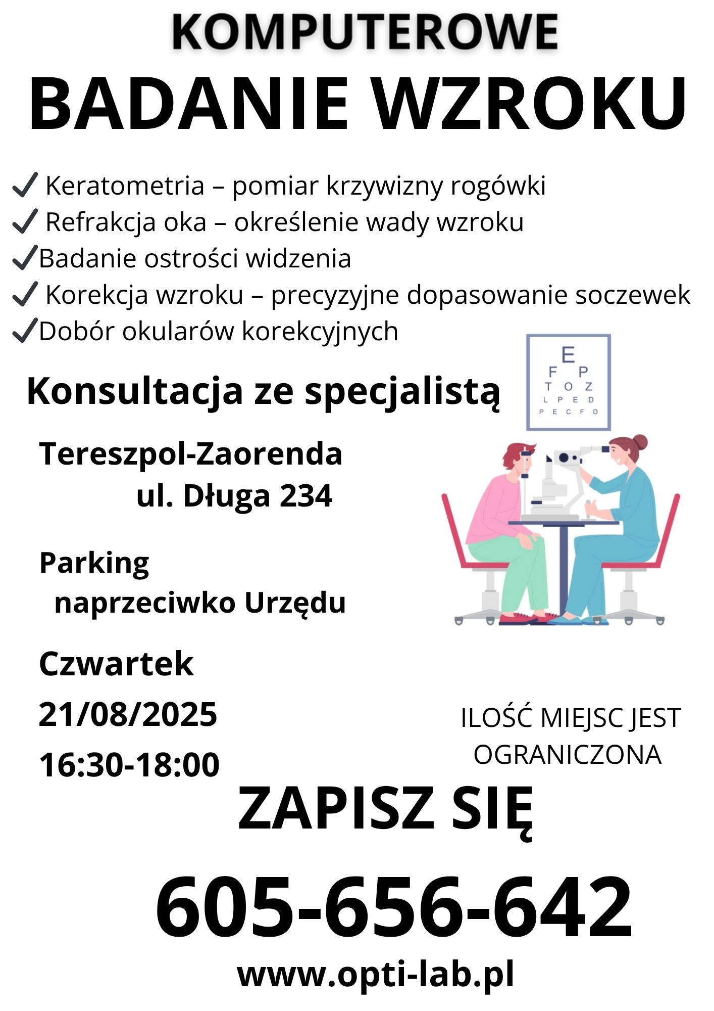 21 sierpnia o godz. 16:30 - 18:00 na parkingu przy Urzędzie Gminy Tereszpol odbędzie się bezpłatne komputerowe badanie wzroku. Zapisy pod nr tel.: 605 656 642. Ilość miejsc ograniczona.