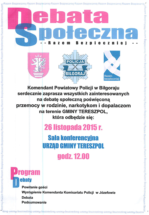 Komendant Powiatowy Policji w Biłgoraju serdecznie zaprasza wszystkich zainteresowanych na debatę społeczna poświęconą przemocy w rodzinie, narkotykom i dopalaczom na terenie gminy Tereszpol. Debata odbędzie się 26 listopada 2015 r. w sali konferencyjnej Urzędu Gminy Tereszpol o godz. 12.00