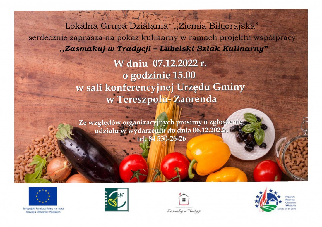 Lokalna Grupa Działania "Ziemia Biłgorajska" serdecznie zaprasza na pokaz kulinarny w ramach projektu współpracy "Zasmakuj w Tradycji - Lubelski Szlak Kulinarny".